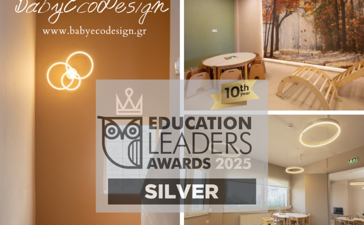 Το υλοποιημένο έργο του αρχιτεκτονικού γραφείου παιδοκεντρικού σχεδιασμού BabyEcoDesign, ”Ολική διαμόρφωση Βρεφονηπιακού Κέντρου ‘Sunnyside’, Θερμη-Θεσσαλονικη: Πώς συνδέεται ο αρχιτεκτονικός σχεδιασμός με τις μεθόδους διδασκαλίας”, απέσπασε το Silver Award, στα Educational Leader Awards 2025, στην κατηγορία ”Επενδύσεις και Υποδομές στην Ιδιωτική Πρωτοβάθμια Εκπαίδευση”