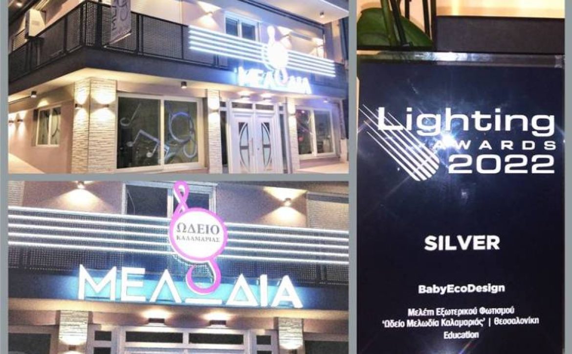 SILVER AWARD στα Lighting Awards 2022, απεσπασε το αρχιτεκτονικό γραφείο παιδοκεντρικου σχεδιασμου Babyecodesign (www.babyecodesign.gr), με την υποψηφιοτητα της μελέτης εξωτερικού φωτισμού στο πλαίσιο ανανέωσης προσόψεων  στο ‘Ωδείο Μελωδια Καλαμαριάς, Θεσσαλονίκη,