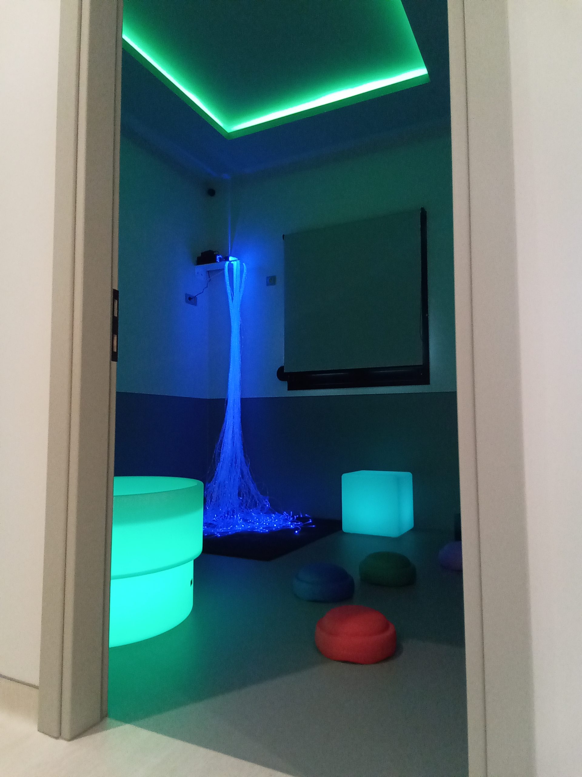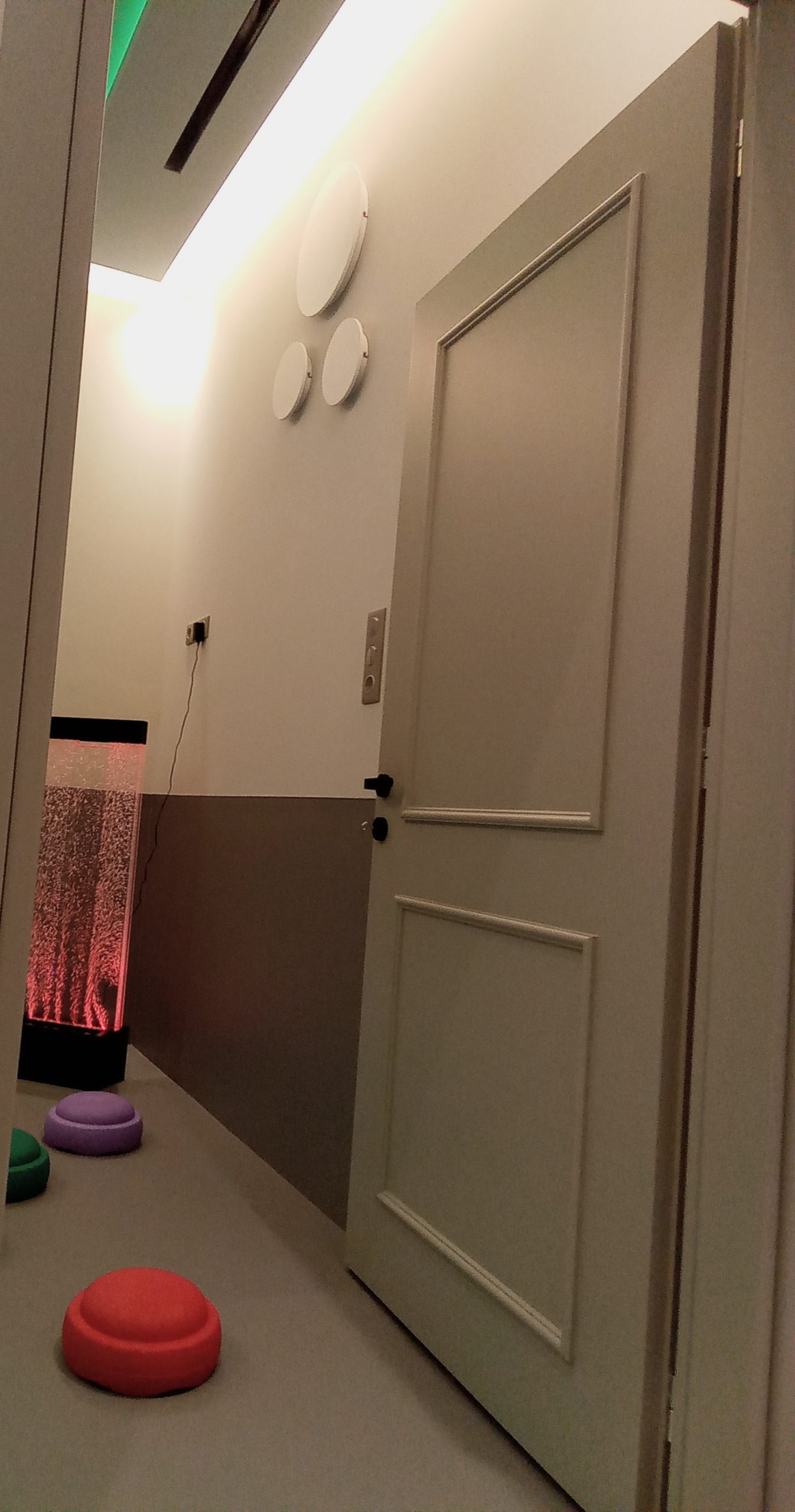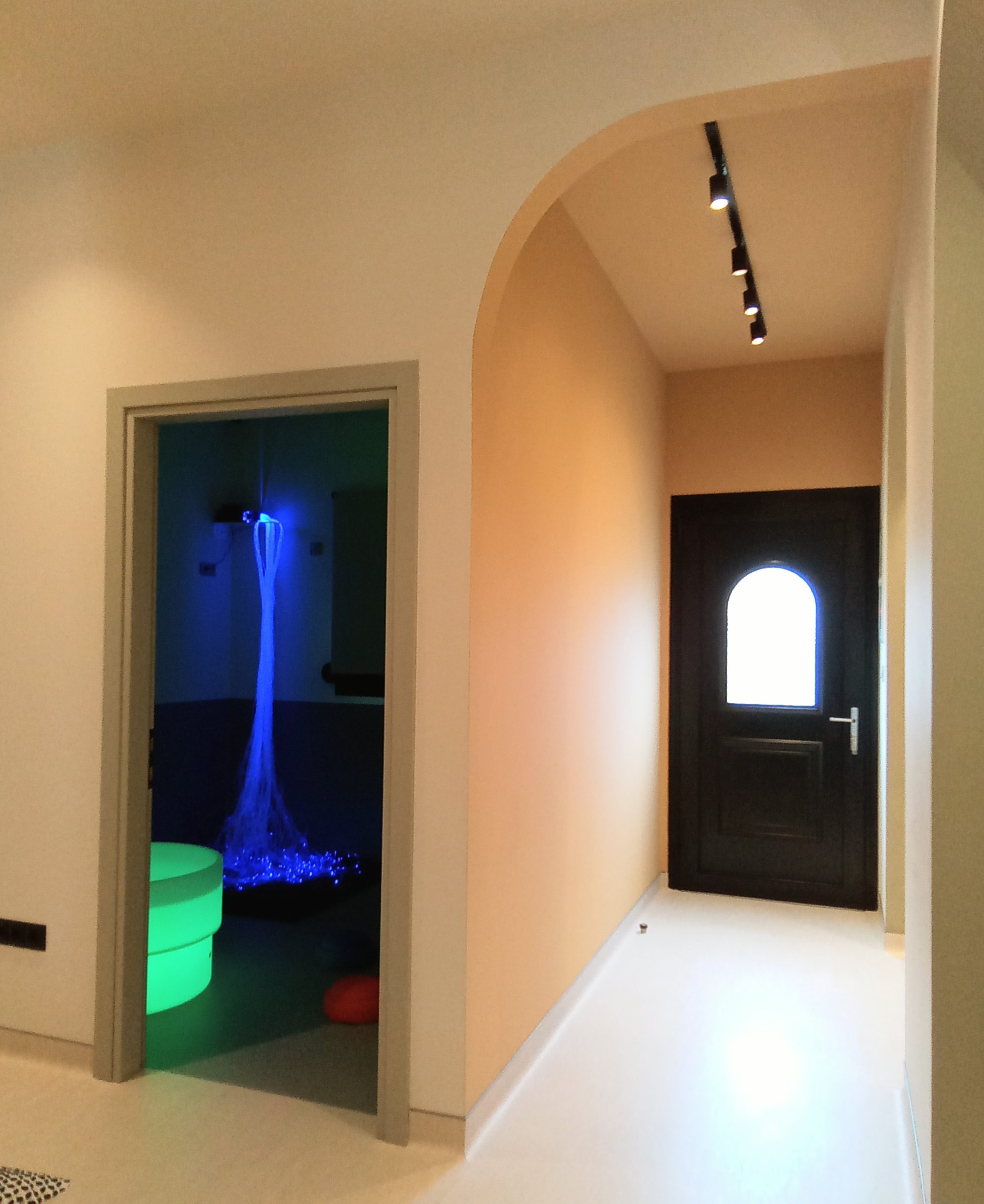 Στη συγκεκριμένη αίθουσα, το αρχιτεκτονικό γραφείο παιδοκεντρικού σχεδιασμού BabyEcoDesign προσέγγισε τον σχεδιασμό της βάσει της αποτελεσματικότητας της λειτουργίας της. Η θεραπεία που πραγματοποιείται σε μια πολυαισθητηριακή αίθουσα (Sensory Integration) προσφέρει διέγερση, χαλάρωση και ευχαρίστηση των αισθητηρίων οργάνων, καθώς και αισθητηριοκινητικές και κοινωνικές εμπειρίες, δίνοντας μεγάλη έμφαση στην αισθητικοκινητική ανάπτυξη του παιδιού. Ορίζονται εξατομικευμένοι θεραπευτικοί στόχοι, ανάλογα με το πόρισμα της αξιολόγησης κάθε παιδιού, προσθέτοντας ή αφαιρώντας τον αντίστοιχο εξοπλισμό, ο οποίος δεν χρειάζεται ως μόνιμη εγκατάσταση στον χώρο. Συνεπώς, το σημαντικό κομμάτι είναι το σταθερό “φόντο” του χώρου, ώστε να παρέχει την απαραίτητη ευελιξία στον θεραπευτή και τον θεραπευόμενο κατά τη διάρκεια της εξατομικευμένης θεραπείας.