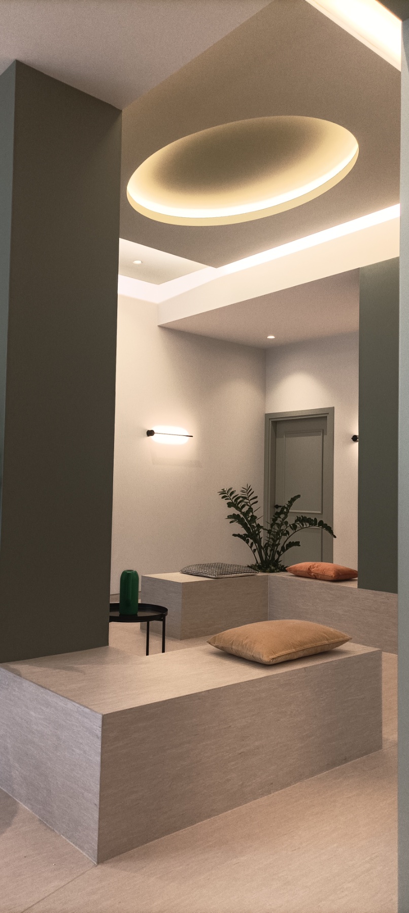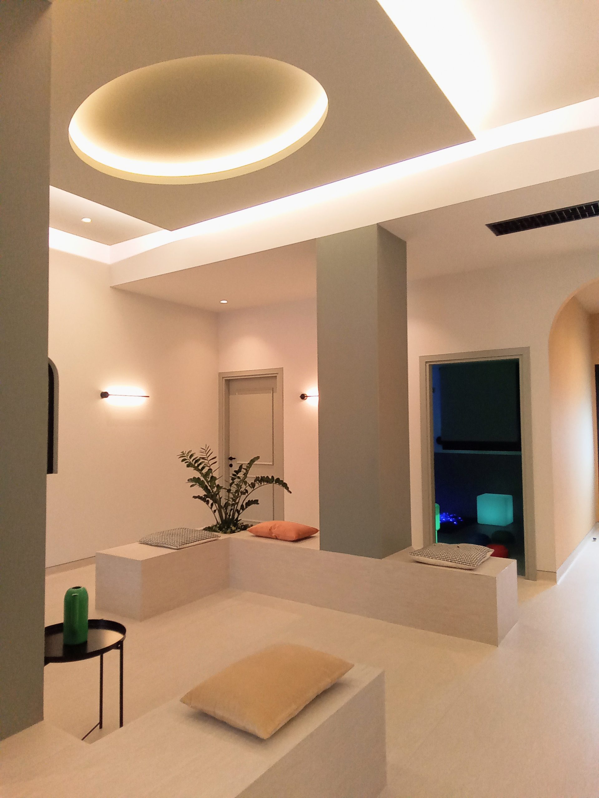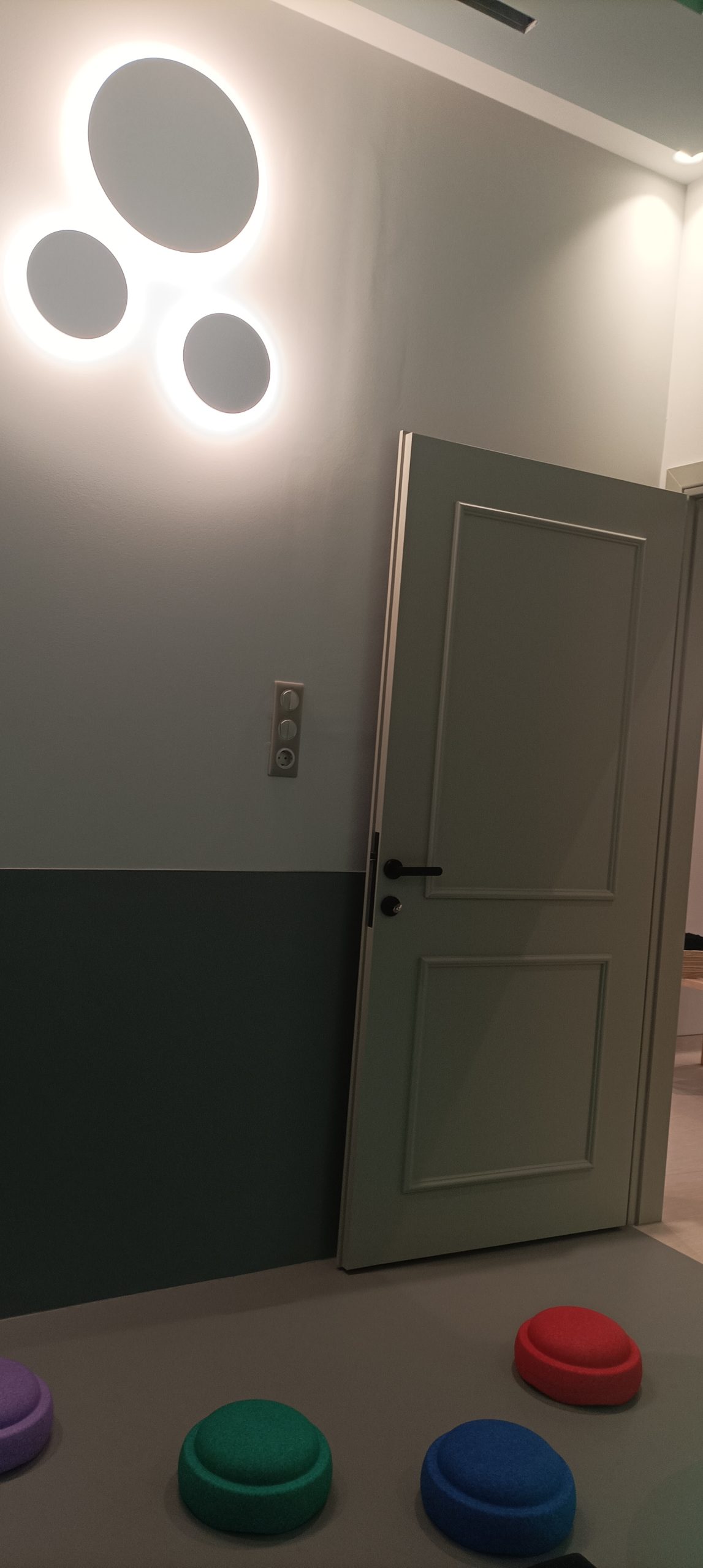 Στη συγκεκριμένη αίθουσα, το αρχιτεκτονικό γραφείο παιδοκεντρικού σχεδιασμού BabyEcoDesign προσέγγισε τον σχεδιασμό της βάσει της αποτελεσματικότητας της λειτουργίας της. Η θεραπεία που πραγματοποιείται σε μια πολυαισθητηριακή αίθουσα (Sensory Integration) προσφέρει διέγερση, χαλάρωση και ευχαρίστηση των αισθητηρίων οργάνων, καθώς και αισθητηριοκινητικές και κοινωνικές εμπειρίες, δίνοντας μεγάλη έμφαση στην αισθητικοκινητική ανάπτυξη του παιδιού. Ορίζονται εξατομικευμένοι θεραπευτικοί στόχοι, ανάλογα με το πόρισμα της αξιολόγησης κάθε παιδιού, προσθέτοντας ή αφαιρώντας τον αντίστοιχο εξοπλισμό, ο οποίος δεν χρειάζεται ως μόνιμη εγκατάσταση στον χώρο. Συνεπώς, το σημαντικό κομμάτι είναι το σταθερό “φόντο” του χώρου, ώστε να παρέχει την απαραίτητη ευελιξία στον θεραπευτή και τον θεραπευόμενο κατά τη διάρκεια της εξατομικευμένης θεραπείας.