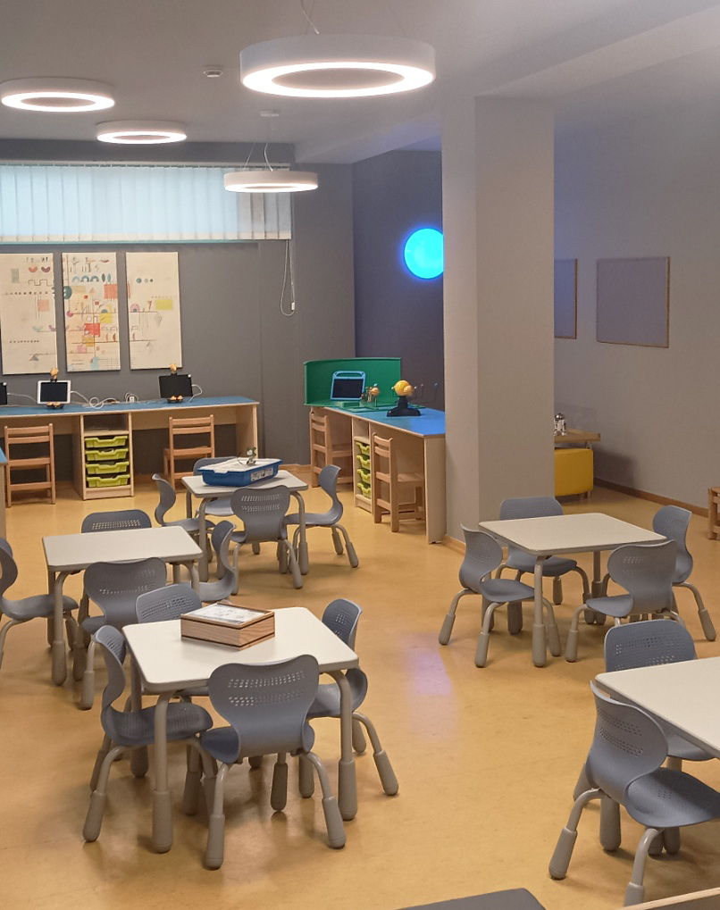 Στις αιθουσες STEM, ξεκιναμε με την παραδοχη οτι ο βασικος εξοπλισμος του χωρου ειναι ηδη αισθητηριακα υπερφορτωμενος. Αυτη η οπτικη ‘υπερπληροφορηση’, χρειαζεται ενα συγκεκριμενο ουδετερο φοντο σχεδιαστικης προσεγγισης, ωστε να μπορεσουμε να εχουμε ενα αρμονικο αποτελεσμα στο μαθησιακο περιβαλλον.