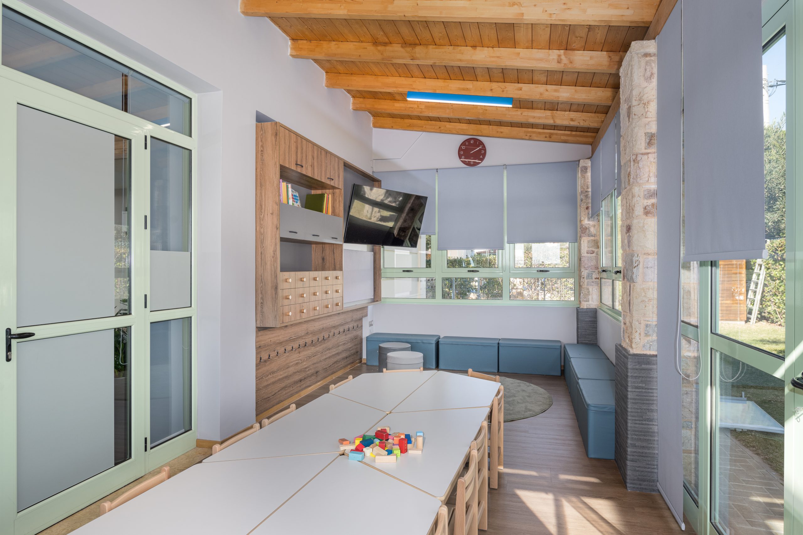 Το έργο αφορά τη διαμορφωση μιας πολυ μικρης αιθουσας διδασκαλιας στο Νηπιαγωγειο Παλλαδιο στην Αθηνα. Οι ιδιαιτεροτητες του χωρου (μικρο μεγεθος, ορθογωνιο σχημα, σχεδον ολοι οι τοιχοι με παραθυρα/πορτες), μας οδηγησαν σε πολυ συγκεκριμενες σχεδιαστικες παρεμβασεις κυριως οσον αφορα τους αποθηκευτικους χωρους, αλλα και την επιλογη και διαταξη του βασικου εξοπλισμου, ωστε ο χωρος να μην επιβαρυνθει και χαθει η λειτουργικοτητα του και η συνολικη αισθητικη του.
