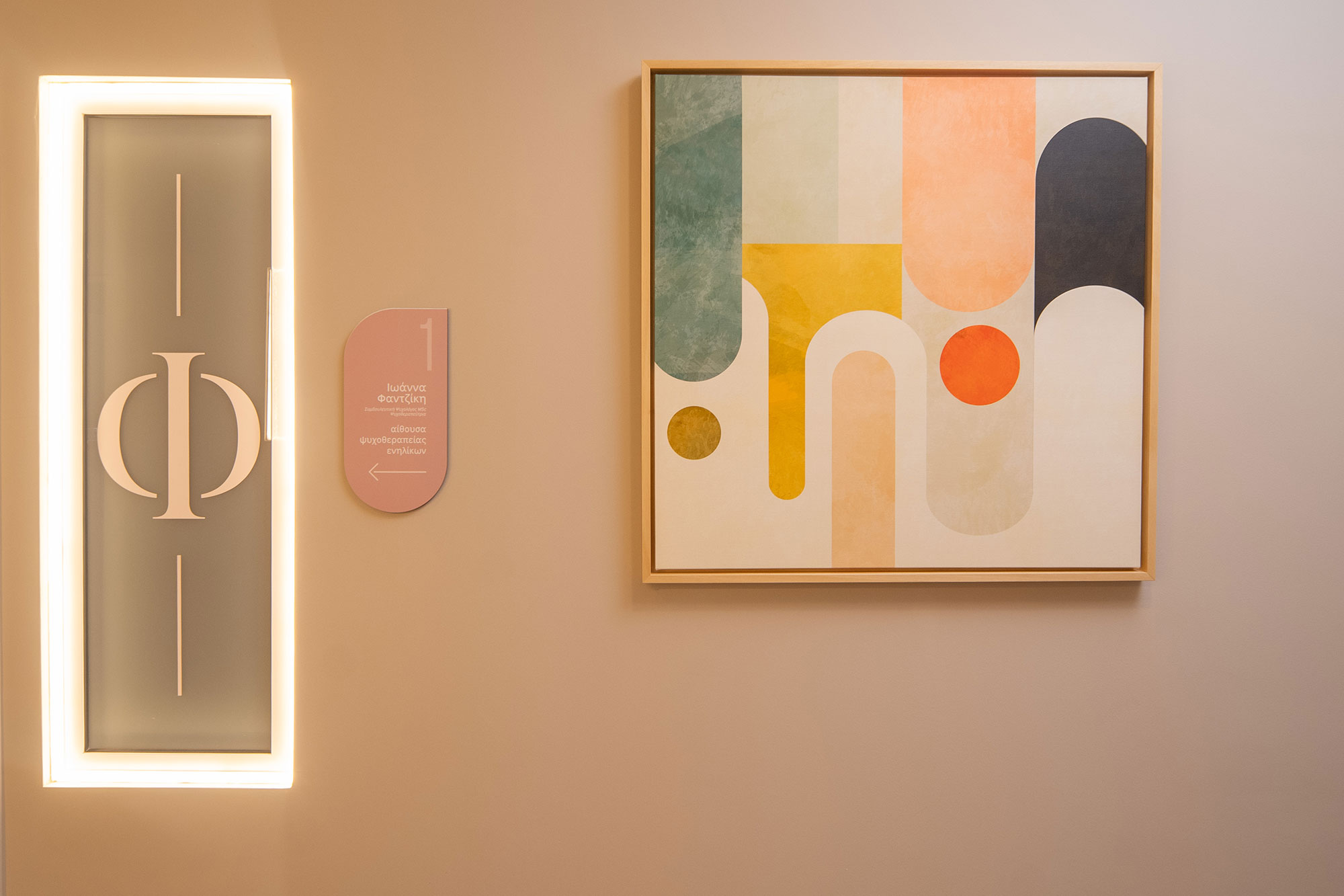 Η κυρια σχεδιαστικη προσεγγιση προκυπτει απο την αναγκη δημιουργιας ενος χωρου, που ο επισκεπτης θα νιωσει συναισθηματικη ασφαλεια και ηρεμια, ωστε να ενισχυθει η συνδεση του με τον θεραπευτη και να βοηθησει στη θεραπευτικη διαδικασια.